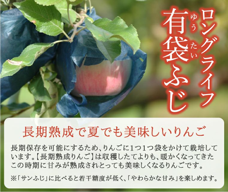【長期熟成りんご】とは【有袋ふじ】のことです。【有袋ふじ】はりんごに袋をかけて栽培した【ふじ】です。