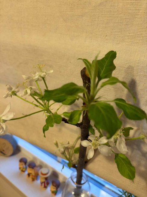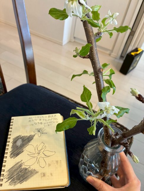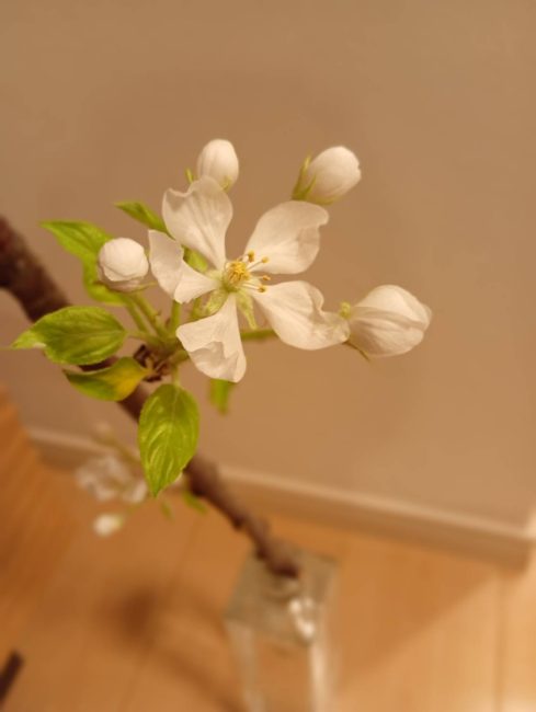 送って頂いたりんごの枝から、可愛いりんごの花が咲きました。