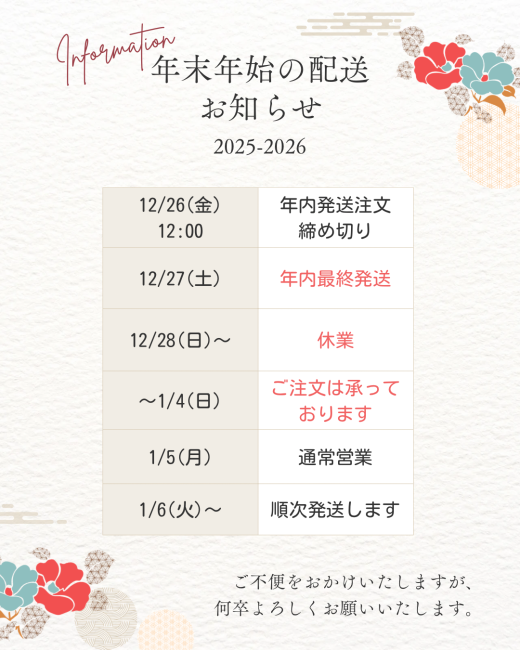 12月26日(金)午後から2026年1月4日(日)の間にご注文いただいた商品は、2026年1月6日(火)より、順次発送いたします。